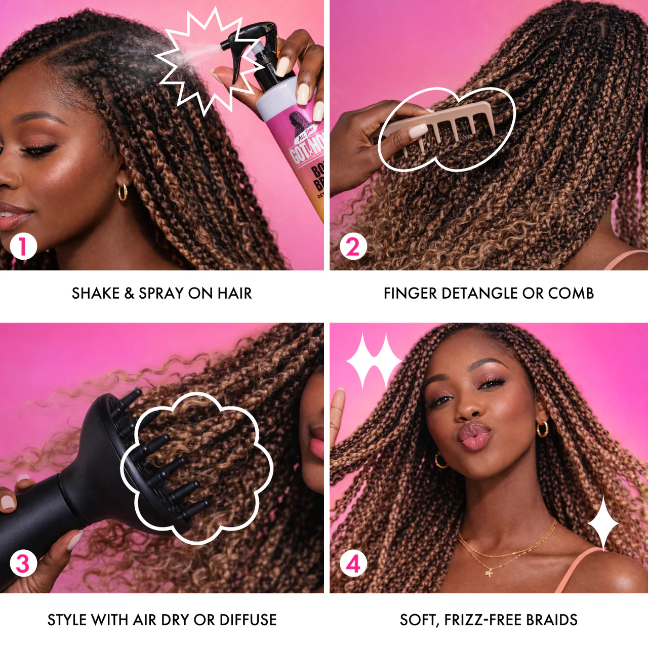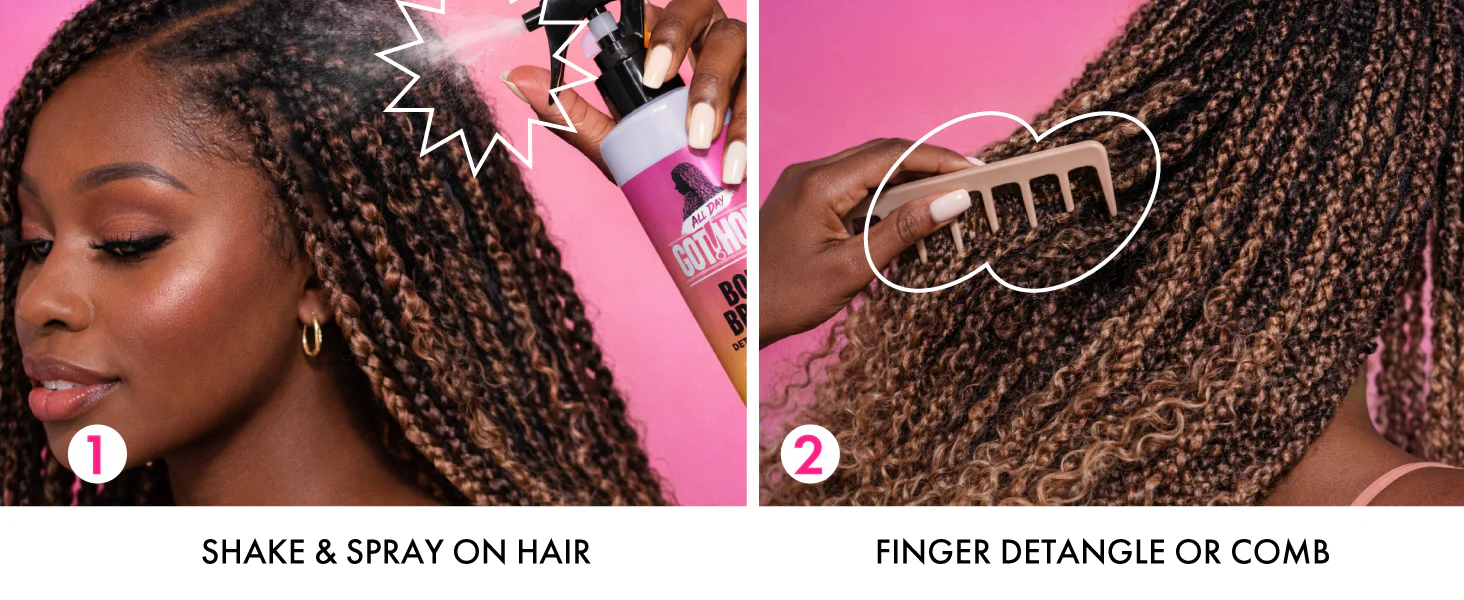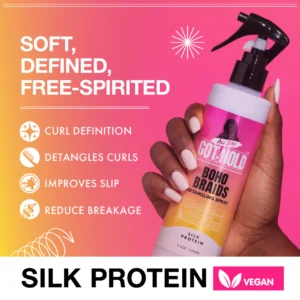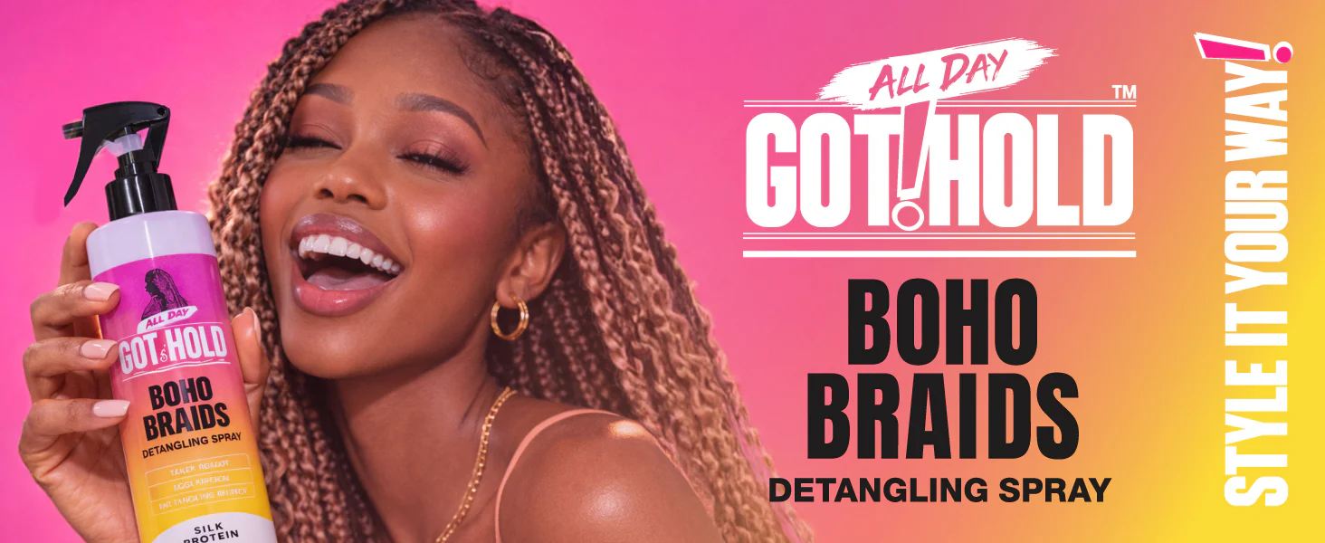 The ALL DAY GOT HOLD Boho Braids Detangling Spray is specially designed to soften and detangle curly and wavy strands used in boho braid styles—without disturbing the braid structure.