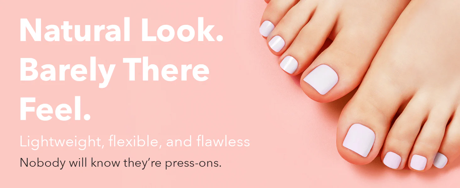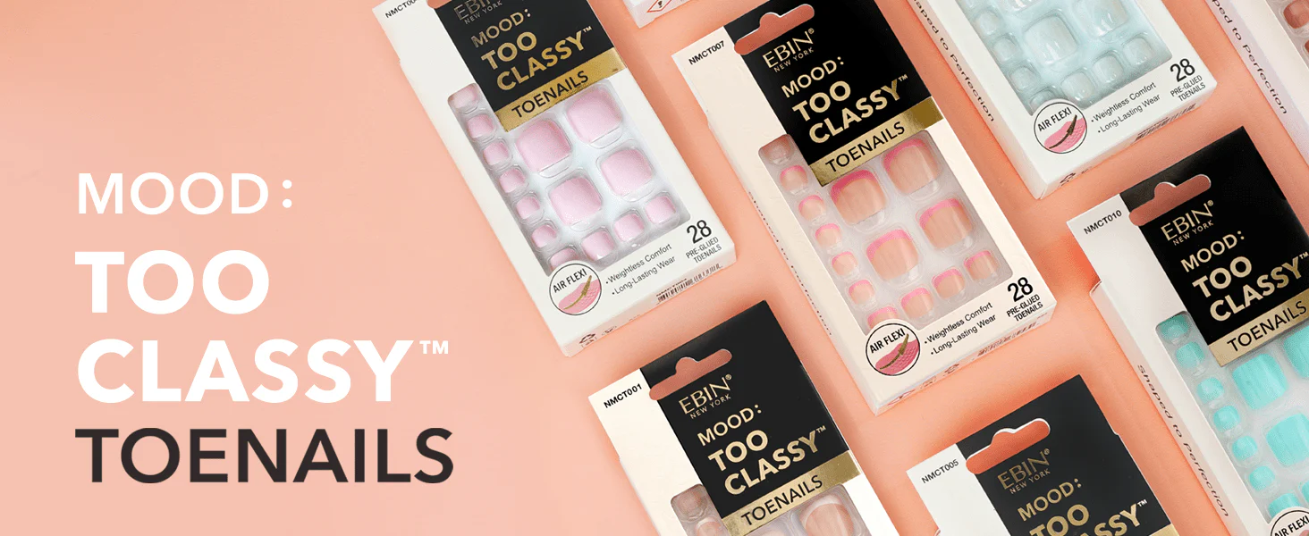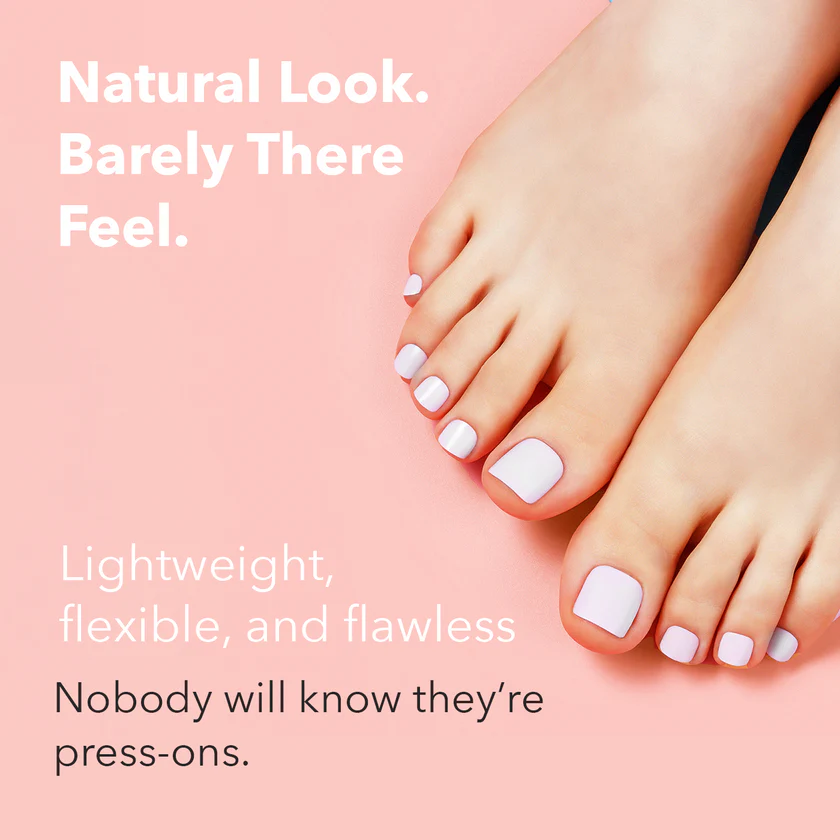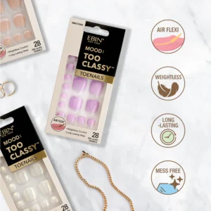 Shaped to perfection, MOOD: TOO CLASSY is a premium pre-glued Toenails collection meticulously developed to deliver the perfect balance of ultra-flexibility, lightweight comfort, and long-lasting wear. Designed with Air Flexi material, these toenails conform seamlessly to the natural shape of your nails, offering a comfortable, barely-there feel that looks as natural as bare nails. Unlike thick, stiff, or breakable press-ons, this collection enhances both flexibility and durability, giving you effortless elegance every day.