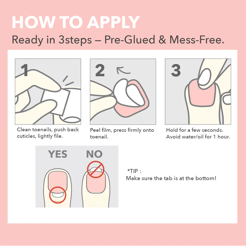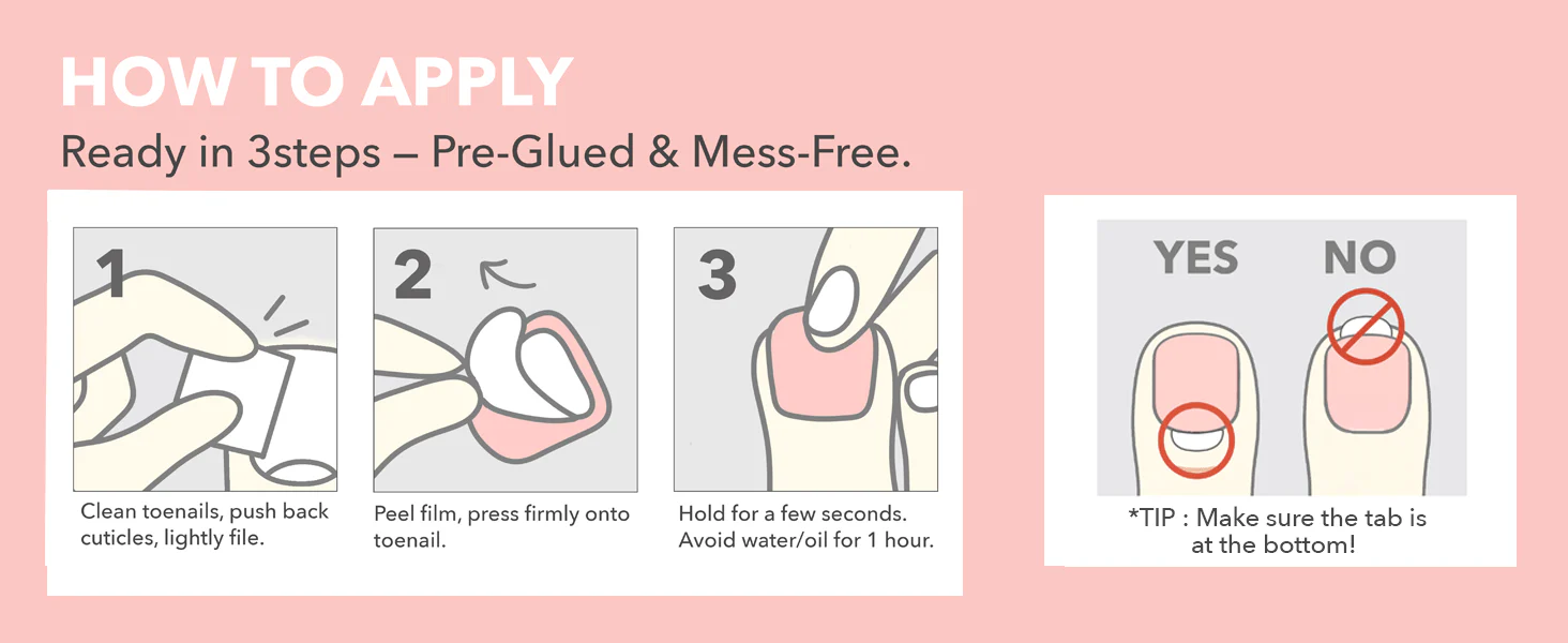Tip: The adhesive tab should be placed at the bottom of the nail. Avoid water and oil for at least 1 hour after application.